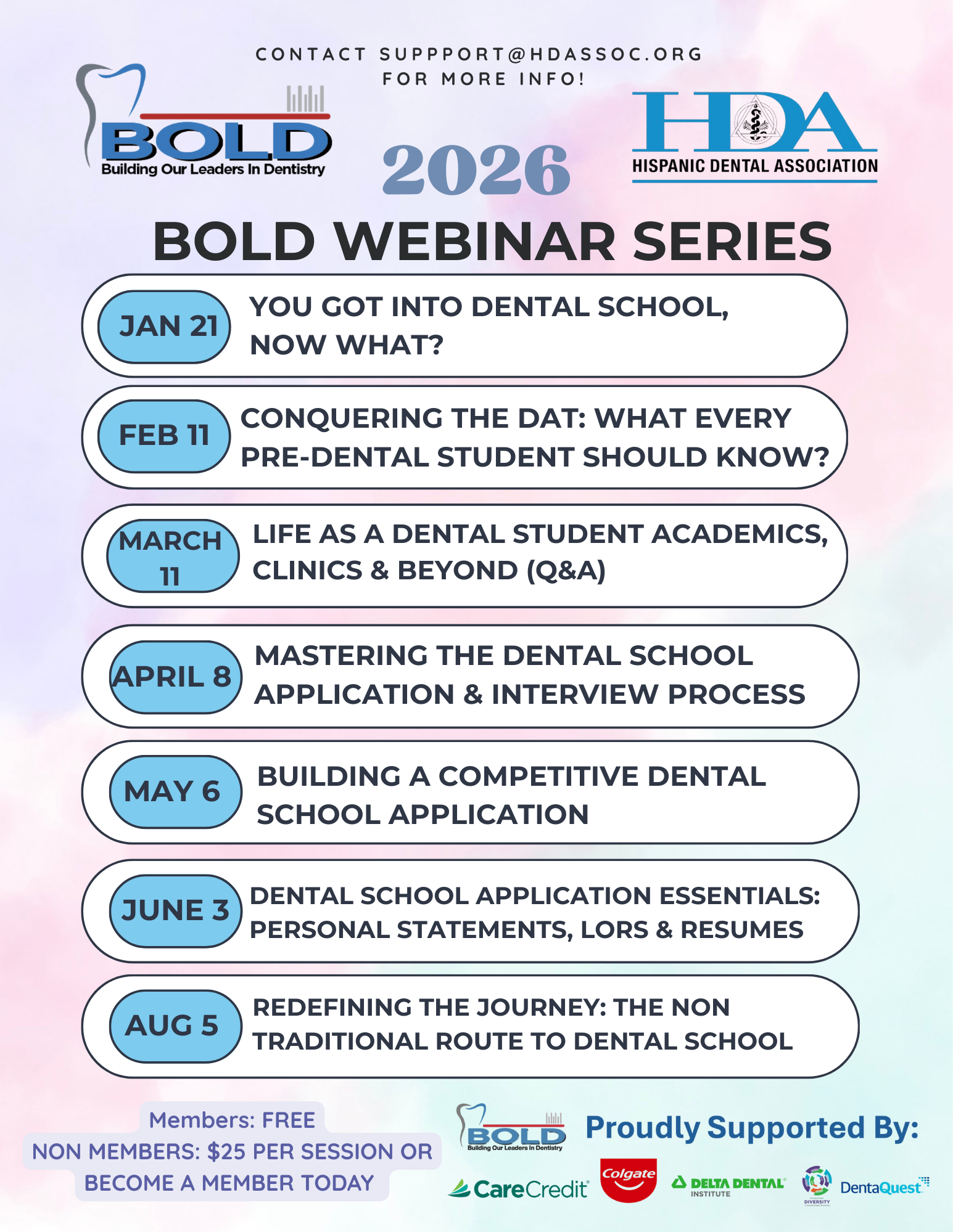 ![]() ![]() The BOLD (Building Our Leaders in Dentistry) program is a pre-dental mentorship program designed to introduce dentistry as a career option and hopefully influence more under-represented minorities to enter the profession. Outreach presentations and workshops can be geared from Head Start/Elementary to High-School/Undergraduate students. No requirements needed to join! What matters most is your genuine passion for dentistry and your dedication to serving our Hispanic community and other underserved groups. In partnership with various organizations, the HDA is able to provide a grant in the amount of $250-$1000 to assist you in your efforts to reach out to potential individuals and schools who may benefit from this program. Applications are accepted throughout the year and assistance will be rewarded on an available basis. BOLD PreDental Membership Application